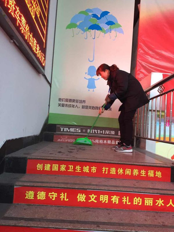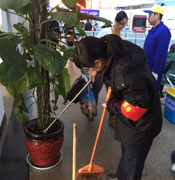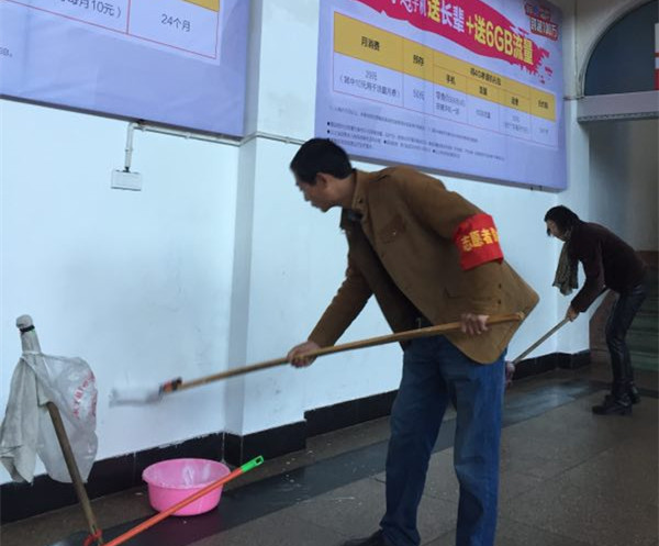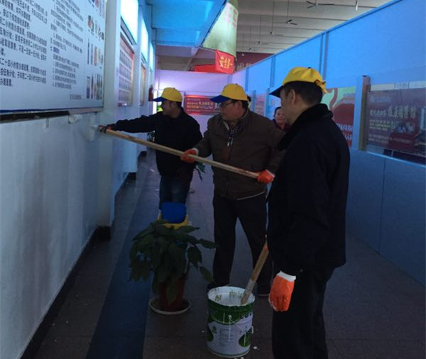 車站由于其特殊性,每天來往的旅客較多,流動性較強。各種原因?qū)е潞蜍噺d、售票廳、發(fā)車區(qū)等區(qū)域的墻壁上留下各式各樣無法擦拭的印痕。隨著文明城市創(chuàng)建“國測”迎檢工作的開始,東站黨員志愿者主動放棄周末的休息時間,對重點區(qū)塊的墻壁進行刷白和整個場地衛(wèi)生死角的清掃。