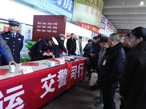 今天麗水市高速交警同志也給旅客帶來(lái)可驚喜,他們揮動(dòng)手中的毛筆為旅客寫下一幅幅承載著吉祥、平安的春聯(lián),旅客們拿著春聯(lián)露出幸福的笑容,為春運(yùn)添上了一抹光彩。