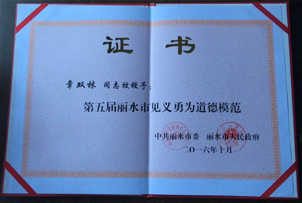 12月9日,蓮都區(qū)委區(qū)政府在蓮都劇場召開表彰會,表彰蓮都區(qū)第五屆道德模范獲獎?wù)摺{惼瘓F長運公司駕駛員章雙林同志獲見義勇為道德模范受到表彰。 在10月31日,章雙林還獲得麗水市第五屆見義勇為道德模范,受到市委市政府表彰。