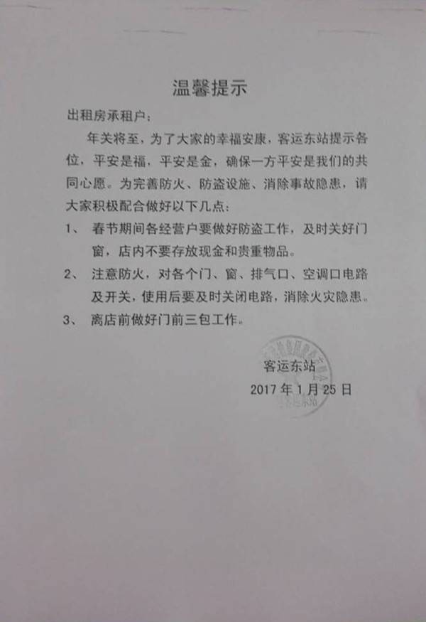 一行人對東站站場和出租房的消防設(shè)施、用火用電情況進行了逐一檢查。要求工作人員加強安全防范,特別要注意春節(jié)期間的用火用電安全,下班后要及時切斷電源。并向周邊承租戶發(fā)出春節(jié)期間的溫馨提示,要求各承租戶在結(jié)束營業(yè)后對店內(nèi)的用水、用電進行仔細檢查,確保消除安全隱患,平平安安、快快樂樂的過春節(jié)。
