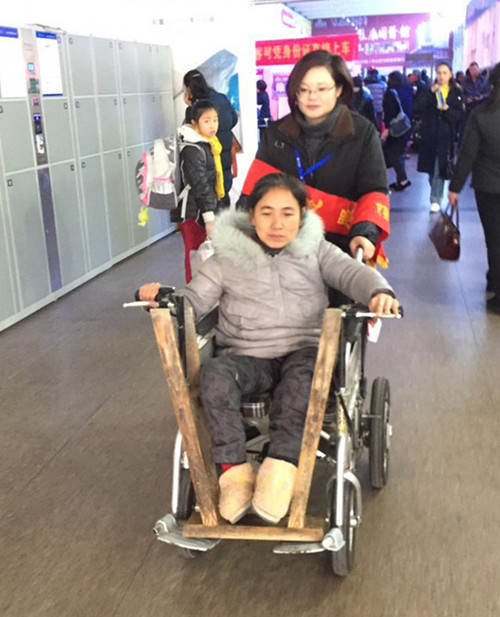 3月1日12點(diǎn)左右,正值出行高峰,售票廳里人頭攢動(dòng),買票的長隊(duì)緩緩挪動(dòng)著。一位中年女性乘客,身穿灰色棉衣,頭頂?shù)念^發(fā)有些斑白,被人群擠到了一旁。她雙手搭在輪椅的扶手上,費(fèi)力地往售票窗口前行。