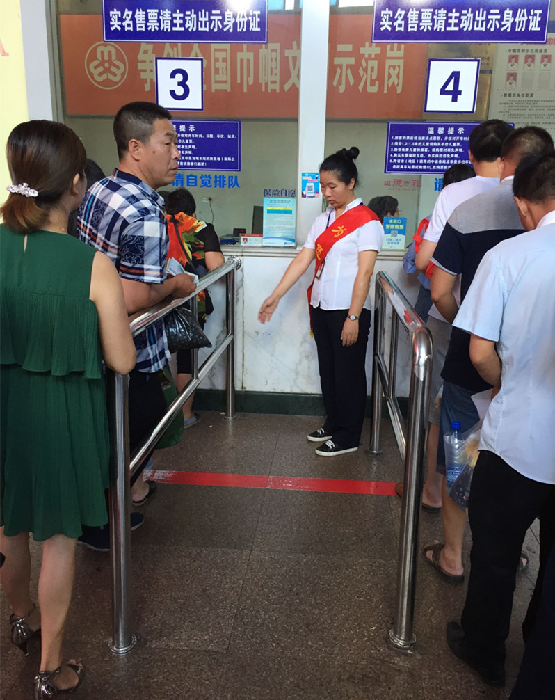 “您好!請不要越過紅線,請站在一米線后等待,”售票廳里尤麗娟正耐心地對正在排隊(duì)買票的旅客進(jìn)行勸導(dǎo)。