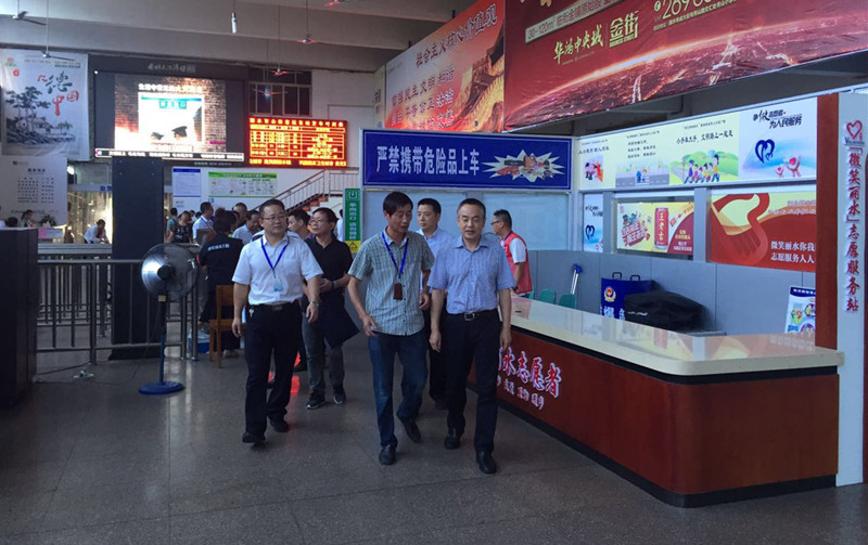 8月16日下午, 浙江省交通廳副廳長趙雁、市交通局副局長葉利東、市運管局副局長金昌平等領導到客運東站檢查安全生產工作。集團公司董事長葉茂、副總經理何赤詮、客運東站負責人江小華陪同檢查。