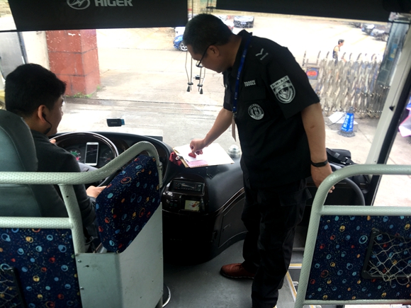 車輛出口門檢崗位上,保衛(wèi)稽查科員認(rèn)真核對(duì)人數(shù)、提醒乘客系好安全帶,把好“五不出站”關(guān)口。