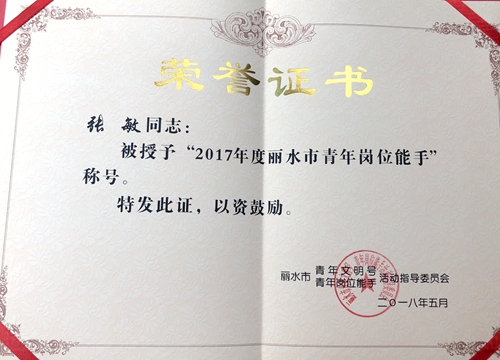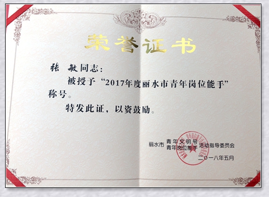 經(jīng)麗水市“青年文明號、青年崗位能手”活動指導(dǎo)委員會評定,集團公司青年團員張敏同志獲評“2017年度麗水青年崗位能手”榮譽稱號。