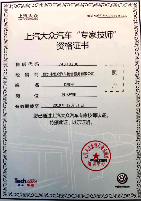 近日,麗水恒眾公司技術(shù)經(jīng)理劉登平被評為上汽大眾“專家技師”。這是上汽大眾品牌進駐麗水市區(qū)以來員工首次獲得該項榮譽。劉登平是上汽大眾在麗水市目前唯一一個獲此榮譽的專家技師。
