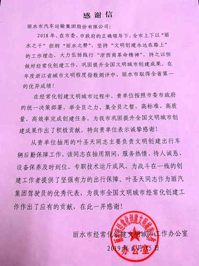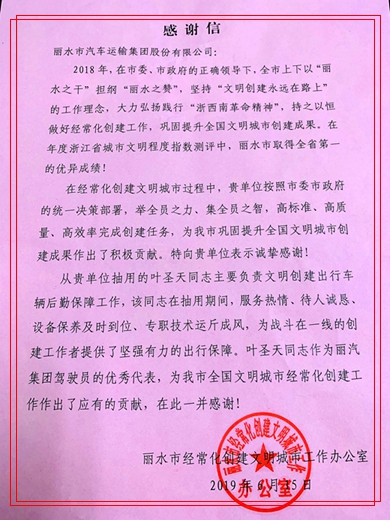 信中還特別表揚(yáng)了從集團(tuán)公司抽用的葉圣天同志,在工作中服務(wù)熱情、待人誠懇、設(shè)備保養(yǎng)及時(shí)到位、專職技術(shù)運(yùn)斤成風(fēng),為戰(zhàn)斗在一線的創(chuàng)建工作者提供了堅(jiān)強(qiáng)有力的出行保障。葉圣天同志作為麗汽集團(tuán)抽用的、主要負(fù)責(zé)文明創(chuàng)建出行車輛后勤保障工作的優(yōu)秀駕駛員代表,為我市全國文明城市經(jīng)?;瘎?chuàng)建工作作出了應(yīng)有的貢獻(xiàn)。