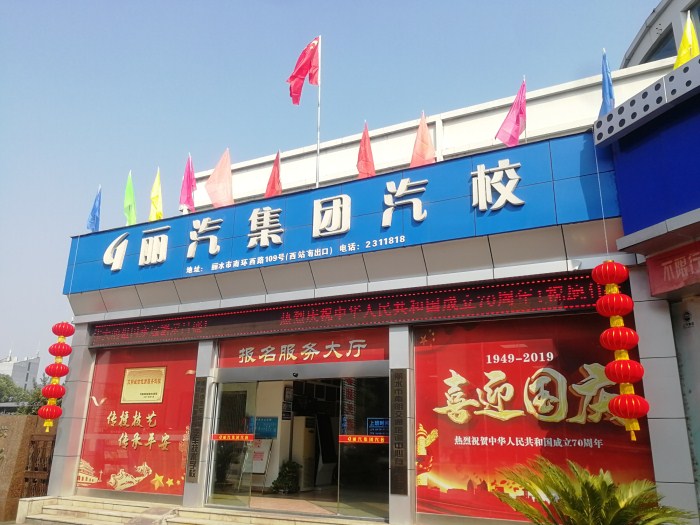 鮮艷的五星紅旗懸掛在汽校報(bào)名注冊(cè)中心大門頂端,四周插著五顏六色的旗幟,在藍(lán)天的映襯下顯得格外耀眼。大門兩側(cè),兩排喜慶的紅燈籠隨風(fēng)搖曳,烘托著祥和的節(jié)日氛圍。LED屏上,“熱烈慶祝中華人民共和國(guó)成立70周年”、“祝愿?jìng)ゴ蟮淖鎳?guó)永遠(yuǎn)繁榮昌盛”的標(biāo)語(yǔ)滾動(dòng)播放,氣氛濃厚?!跋灿瓏?guó)慶”的巨大金色標(biāo)語(yǔ)和汽校“傳授技藝、傳承平安”核心價(jià)值的巨幅廣告相互輝映,相得益彰。