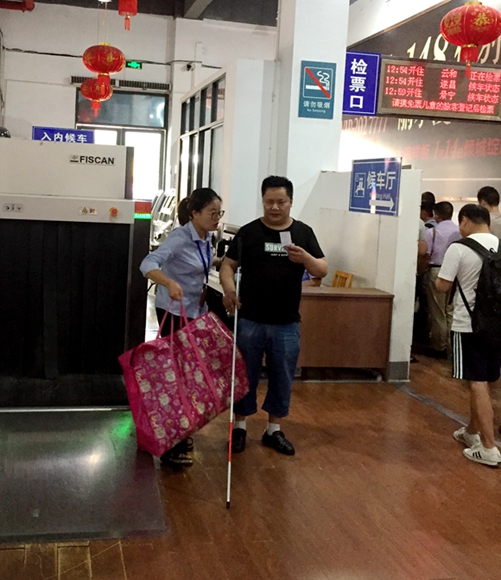 “我們就是您的眼睛啊,有我們?cè)?,您就安心吧!?br/> 11月4日下午,麗水高鐵站公路客運(yùn)上客點(diǎn)里,檢票的空檔,隔著窗戶,聽到如此暖心的一句話,我不禁抬頭尋聲望去。看到我們的導(dǎo)乘員劉遠(yuǎn)玲扶著一位男士,往候車室慢慢走進(jìn)來。仔細(xì)一看,是一位盲人旅客。劉遠(yuǎn)玲把旅客帶到了離檢票口最近的位置坐下,對(duì)旅客說:“先生,您坐在這里稍等下,售票窗口人多,怕擠著您,13點(diǎn)09的松陽(yáng)車馬上就到了,把證件交給我,我?guī)湍哑辟I好?!庇洲D(zhuǎn)身對(duì)我交代了下:“等下檢票的時(shí)候怕是人會(huì)多,你注意下,別讓旁邊的人撞著這位同志?!?br/> 盲人旅客聽著劉遠(yuǎn)玲走開的聲音,很激動(dòng)的對(duì)我說:“你們站的工作人員真好,從我一進(jìn)車站就過來扶著了?,F(xiàn)在又幫忙買票。真好,真好……”話剛落,劉遠(yuǎn)玲買好票遞了過來,“13:06分了,你先幫他把票檢了,我現(xiàn)在扶他出去等車,這樣時(shí)間剛剛好。”