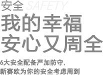 安全安全籠式車身、井字鋼梁、潰縮空間設(shè)計 4輪29次安全碰撞測試,以國際安全標(biāo)準(zhǔn)呵護(hù)您的旅程 ABS+EBD、五座標(biāo)準(zhǔn)安全帶(前排帶預(yù)張緊功能) 全系標(biāo)配雙安全氣囊、安全碰撞可潰縮吸能轉(zhuǎn)向柱 后排車門兒童安全鎖和后排IS0FIX兒童安全座椅固定裝置 行人保護(hù)安全車頭雙翼區(qū)