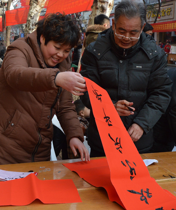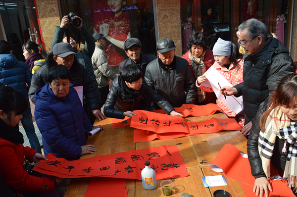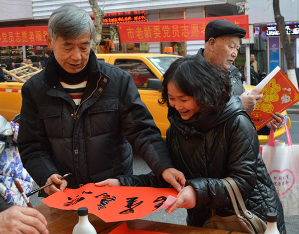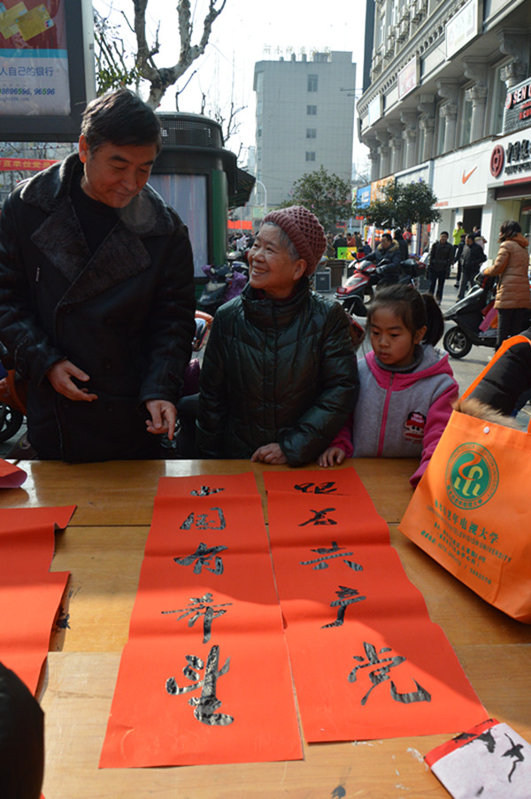 幾張小桌子拼成的簡易書案更是黨員一條街上靚麗的風(fēng)景。三位老同志一落筆,書案旁邊一下子就圍滿了人,大家一邊排隊(duì)等候著“墨寶”,一邊點(diǎn)贊著三位老師的書法。葉女士高興地說:“手寫的春聯(lián)不僅更有年味,而且還是在弘揚(yáng)中國的書法藝術(shù)。中國傳統(tǒng)的年俗文化,現(xiàn)在已經(jīng)越來越難得了?!币粚﹄p胞胎寶寶的父母恰巧推著嬰兒車從服務(wù)點(diǎn)前經(jīng)過,趕緊請老師寫下“開心寶貝”四個字,還說是給孩子倆最珍貴的新年禮物。