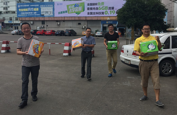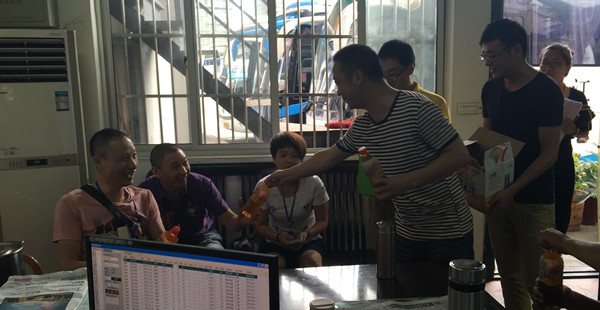 經(jīng)理梁巍、副經(jīng)理王斌、計(jì)財(cái)科科長(zhǎng)厲志南和運(yùn)務(wù)科的蔡亞飛各捧著一箱冷飲去送清涼。