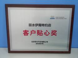 近年來,伊翔公司在主抓生產(chǎn)的同時(shí),講實(shí)效、重管理,不斷完善企業(yè)內(nèi)部管理制度,服務(wù)質(zhì)量日趨提升。日前,從北京現(xiàn)代公司總部傳來喜訊:麗水市伊翔汽車銷售服務(wù)有限公司榮獲北京現(xiàn)代汽車有限公司頒發(fā)的“客戶貼心獎(jiǎng)”和“M/S進(jìn)步獎(jiǎng)”,王明敬獲北京現(xiàn)代2012年度“優(yōu)秀銷售顧問”稱號(hào)。