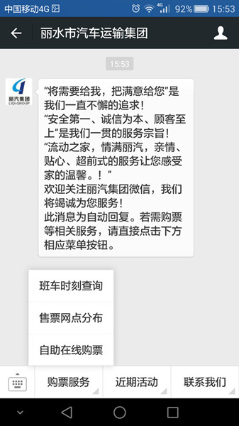 假期將至,為滿足旅客多樣化的購(gòu)票需求,現(xiàn)旅客只需關(guān)注“麗汽集團(tuán)”微信公眾號(hào),就能實(shí)現(xiàn)通過(guò)手機(jī)終端直接購(gòu)買(mǎi)從東、西汽車(chē)站始發(fā)班線的車(chē)票,還可以退票。
