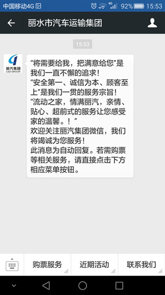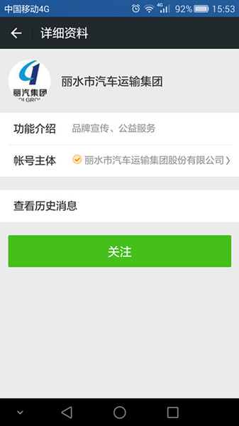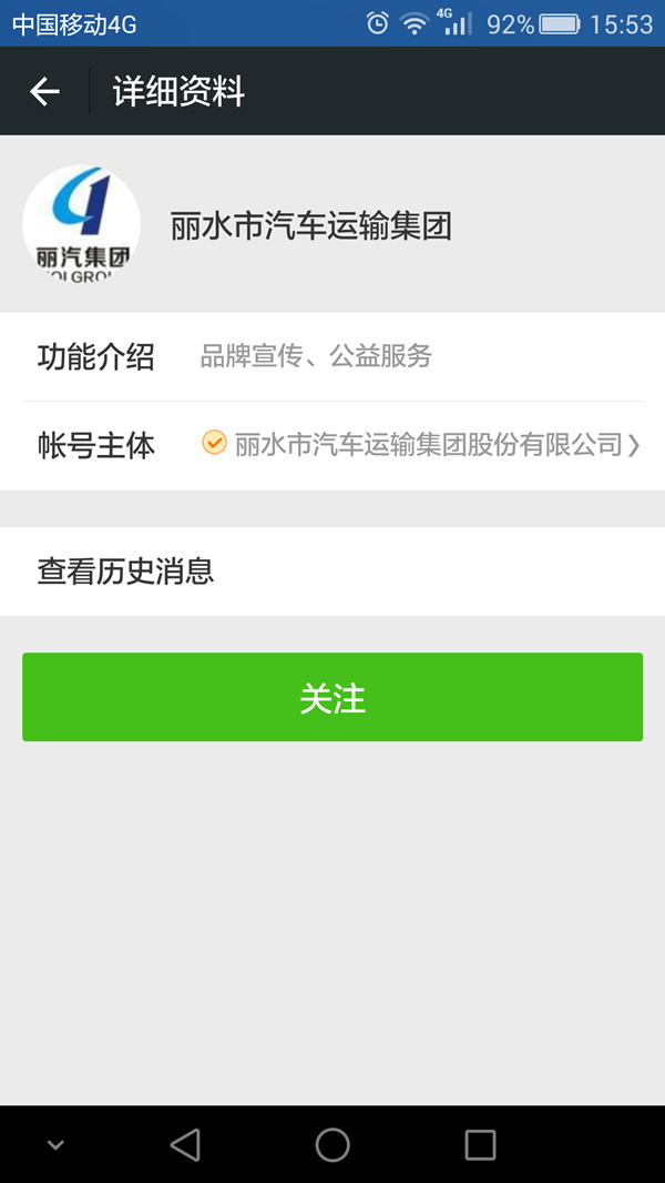 (1)打開(kāi)微信,搜索添加“麗水市汽車(chē)運(yùn)輸集團(tuán)”微信公眾號(hào)或直接掃取二維碼,點(diǎn)擊關(guān)注。