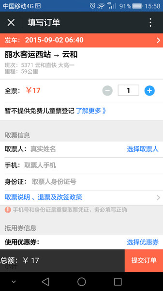 (4)點(diǎn)擊選擇需乘坐的班次,進(jìn)入填寫(xiě)頁(yè)面,填寫(xiě)取票人姓名、手機(jī)號(hào)碼及身份證。