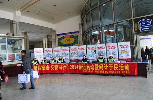 活動(dòng)現(xiàn)場設(shè)立了咨詢臺(tái),交警部門通過發(fā)放《駕駛?cè)舜哼\(yùn)安全手冊》、《兒童交通知識(shí)畫冊》、《駕駛?cè)伺嘤?xùn)教程》等交通安全書籍和宣傳畫冊,向廣大旅客們進(jìn)行春運(yùn)交通安全宣傳。此外,還向旅客們派送印有道路安全溫馨提示的年歷、新春福字,為旅客送上新年的祝福和平安。