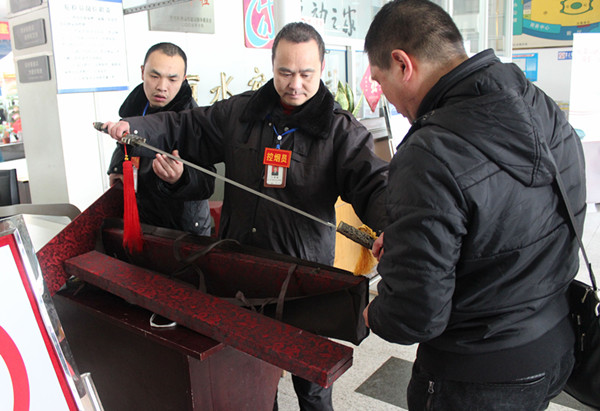 西站安檢崗位潘峰、金翔、鐘韶華值班三位同志在值班。今天客流量大,是平時(shí)的一倍左右,安檢員們工作也都比往常更認(rèn)真仔細(xì)了。80:50分左右,鐘韶華、金翔發(fā)現(xiàn)一名男子提著三盒包裝精美的禮盒經(jīng)過安檢。鐘韶華忙禮貌上前將該男子叫到一邊,讓他開包檢查。經(jīng)檢查,三盒均為龍泉寶劍,其中兩把寶劍未開封可攜帶,一把寶劍已開封不能攜帶上車,按規(guī)定對這把寶劍進(jìn)行了登記暫扣處理。該男子也很配合安檢員的工作,直夸安檢員們工作認(rèn)真細(xì)致。