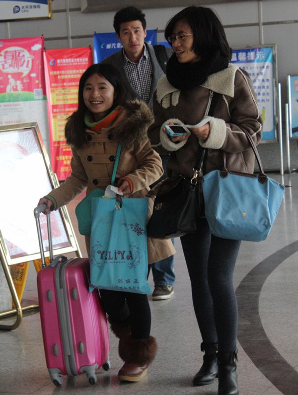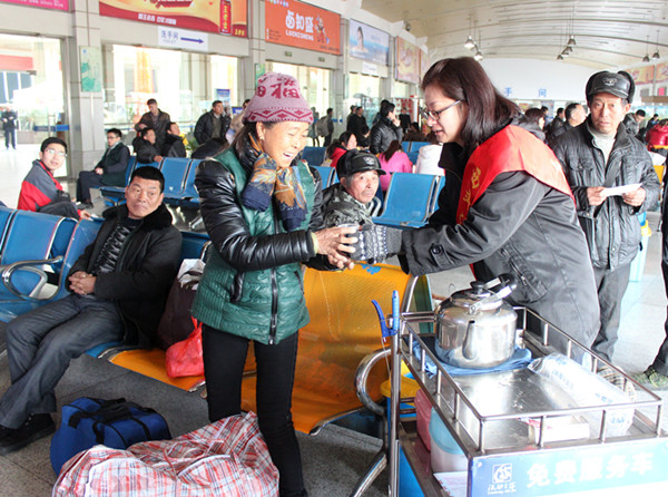 服務(wù)班的陳燕早早的推著服務(wù)車在候車室服務(wù),為春運(yùn)第一天踏上回家旅途的人們免費(fèi)送上一杯杯熱氣騰騰的開水。陳燕說,為旅客服務(wù)是她的本職工作,農(nóng)民工兄弟們在外工作了一年才回一趟家,她和姐妹們要盡自己所能,為他們提供最優(yōu)質(zhì)的服務(wù)。服務(wù)班已備好了生姜茶,隨著氣溫的下降,姐妹們將會推車送姜茶服務(wù),為他們回家的途中送上一抹溫暖。