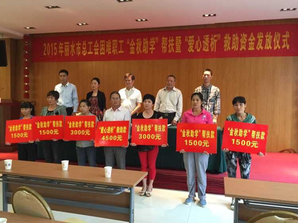 9月18號下午三時,2015年麗水市總工會困難職工“金秋助學”幫扶暨“愛心透析”救助資金發(fā)放儀式在市總工會三樓會議室里舉行,麗汽集團5名困難職工獲救助。