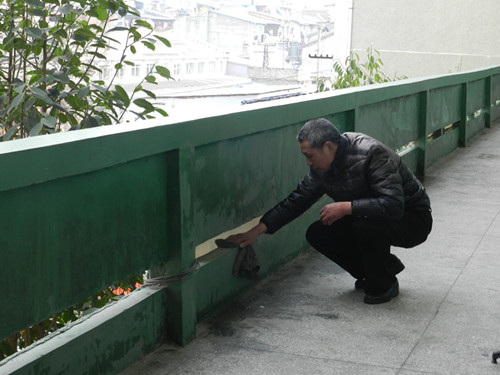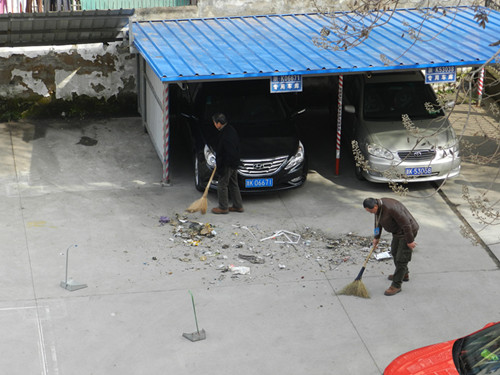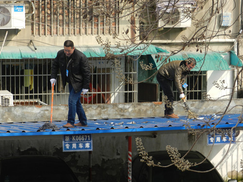 鄭華副校長、金健飛副校長清理遮雨棚上的垃圾 打掃停車場地
