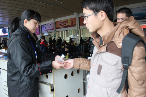 早已歸心似箭的旅客拎著大包小裹立刻在1號檢票口排起了長龍,趙妍不慌不忙的雙手接過旅客的車票看一眼票,然后刷票、撕下票根,一個、兩個、三個……一會兒的功夫,趙妍便完成了對幾十個旅客的檢票工作。“從心理上來說,旅客等候檢票的時候都很著急,所以我們都會盡量檢得更快些?!壁w妍說,春運期間,最多時一天將近要檢近一千五六百張票,撕票根都撕到手酸。