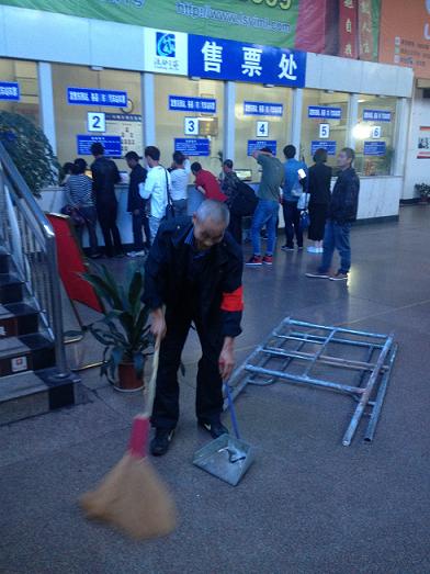 近段時期,客運東站正如火如荼的進行著創(chuàng)衛(wèi),各部門,各崗位都把創(chuàng)衛(wèi)當作頭等大事來抓,不敢有一絲的懈怡。我們的老同志也不甘人后,他時常在工作的間隙出現(xiàn)在候車大廳,一會兒撿個雜物、一會兒夾個煙頭、一會兒耐心的勸導旅客不要亂扔垃圾。看!當他發(fā)現(xiàn)候車室值班室因裝修留下了一些白色粉塵,就趕忙拿起掃帚,將這些死角清理干凈。他的干勁一點也不輸給那些剛參加工作沒幾年的小年輕。當我給他拍照時他還很不好意思的用背部躲閃著我的鏡頭。一邊還說著:“不要拍我!你去拍那些做的更好的同志”!