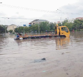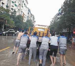 20日的洪水從清晨開始就一直處于上漲過程當中,市區(qū)多處受淹嚴重。為更快速的搶救進水車輛,安撫客戶情緒,在指揮中心的統(tǒng)一指揮下,多組救援小組深入各受災片區(qū),他們與洪水周旋,在水中作戰(zhàn),開展搶救工作 。在水東、在夏河、在三巖寺,救援小組一方面與客戶積極聯(lián)系溝通,了解受災情況; 一方面趟入渾濁的洪水中積極找尋施救線路。因水位不斷上漲,水東大橋、三巖寺等路段交通相繼中斷,施救車輛根本就進不了受災片區(qū),已進入受災片區(qū)的也開展不了救援工作,個別施救車輛還受困于現(xiàn)場,這可急壞了救援人員和客戶。隨著時間的推移,指揮中心積壓的待救援信息越來越多。水不退,車就進不去,光靠人在水中推是解決不了問題的,怎么辦? 伊翔公司一方面隨時關(guān)注水位情況,一方面積極向各方求援,待水位梢有下降,適合搶救時,能迅速全面開展搶救工作。