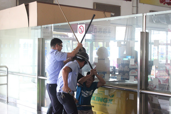 行車員發(fā)現(xiàn)普客候車廳內(nèi)有一名醉酒男子情緒激動揮舞木棍,危及旅客安全,立即跑向調(diào)度室向業(yè)務站值班站長報告,值班站長接到報告后通過對講機向其它崗位呼叫。并立即組織本部門值班人員趕到現(xiàn)場將旅客疏散到安全的區(qū)域;保衛(wèi)科接到報告后立即做出回應,啟動反恐防范應急預案,攜帶反恐防范器具前往現(xiàn)場控制住施暴者;同時由2名保衛(wèi)人員組成警戒協(xié)調(diào)組也到達現(xiàn)場負責外圍的警戒工作。