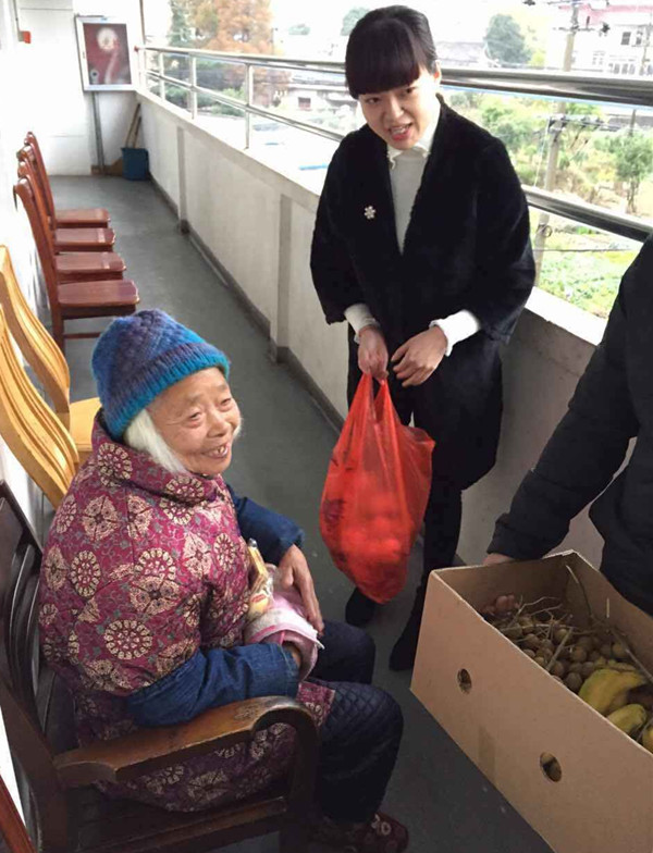 經(jīng)過20多分鐘的車程,下午3點,我們的車子到達(dá)了靈山敬老院,因為事先聯(lián)系,已經(jīng)有許多老人在門口等候我們。與在場的老人一一問候后,我們十余名團員迅速分工,將帶來的水果和餅干等點心給不同樓層的老人送上,并帶上大家的祝福。我們的到來,使原本安靜的敬老院變得熱鬧,歡笑聲此起彼伏,我們陪著老人聊天,給他們送上熱騰騰的開水,將順手剝好的水果遞上。