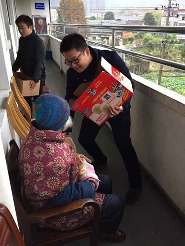 經(jīng)過20多分鐘的車程,我們到達(dá)了靈山敬老院,那里很安靜祥和,大家都激動不已。因為事先聯(lián)系過,一下車,就有許多老人在門口等候我們了??粗覀儙淼囊幌湎涞乃秃脦状娘灨傻案鈺r,身旁的老人就一直沖著我們說:“你們太好了,還買這么多東西給我們,真是當(dāng)不起的”。我們十余名團(tuán)員迅速分工,有的將水果和餅干分箱裝袋,有的負(fù)責(zé)派送三樓的老人,有的負(fù)責(zé)派送二樓的老人,經(jīng)過一個多小時的努力,我們終于全部派送完全部的物品。