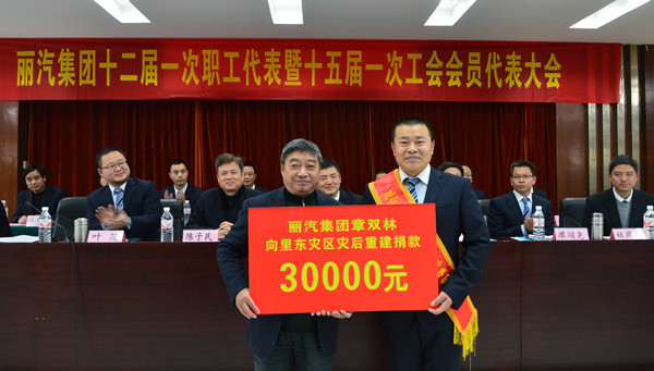 12月25日下午,麗汽集團(tuán)召開(kāi)十二屆一次職工代表暨十五屆一次工會(huì)會(huì)員代表大會(huì),在大會(huì)正式議程開(kāi)始前,章雙林決定,捐贈(zèng)出剛剛獲得的五萬(wàn)元獎(jiǎng)金,其中3萬(wàn)元捐贈(zèng)給里東災(zāi)民幫助他們?yōu)暮笾亟?,剩余?萬(wàn)元獎(jiǎng)金捐給身邊急需救助的人員。章雙林在發(fā)言中說(shuō):“我只是一個(gè)平平常常的客車(chē)司機(jī),只是履行了一個(gè)司機(jī)的責(zé)任。我做了一件小事,公司和社會(huì)卻給了我這么高的榮譽(yù),給了我這么多的贊美和鼓勵(lì),更加堅(jiān)定了我今后努力做好旅客服務(wù)工作的信心和決心。麗水是我生長(zhǎng)的地方,我對(duì)這里充滿(mǎn)了感情。麗汽集團(tuán)是我成長(zhǎng)的地方,我對(duì)這里充滿(mǎn)了感激。為回報(bào)大家,現(xiàn)在我決定,將其中3萬(wàn)元獎(jiǎng)金,捐給里東災(zāi)民,幫助他們?yōu)暮笾亟ǎS嗟?萬(wàn)元,我也將陸續(xù)捐出來(lái),幫助身邊急需救助的人員。希望里東災(zāi)民早日重建家園,希望身邊的人員都健康平安?!?br/> 隨后,麗水市蓮都區(qū)慈善總會(huì)會(huì)長(zhǎng)朱祖新來(lái)到會(huì)議現(xiàn)場(chǎng)接受了章雙林的捐款。