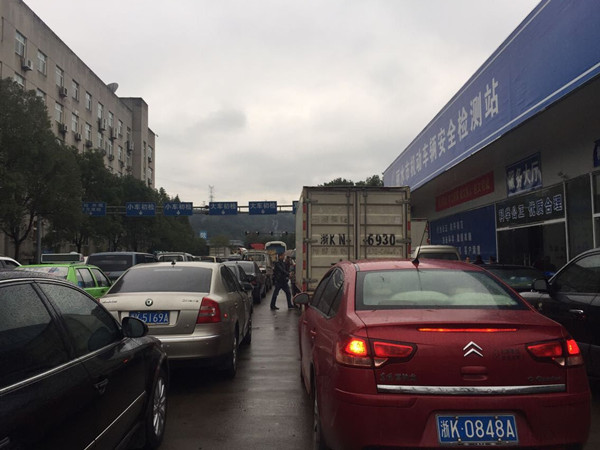 “車(chē)子都排到馬路上啦,又是緊張忙碌的一天??!”面對(duì)排成長(zhǎng)龍的待檢汽車(chē),一大早就上班的安檢站員工陳永軍暗暗的給自己打氣。