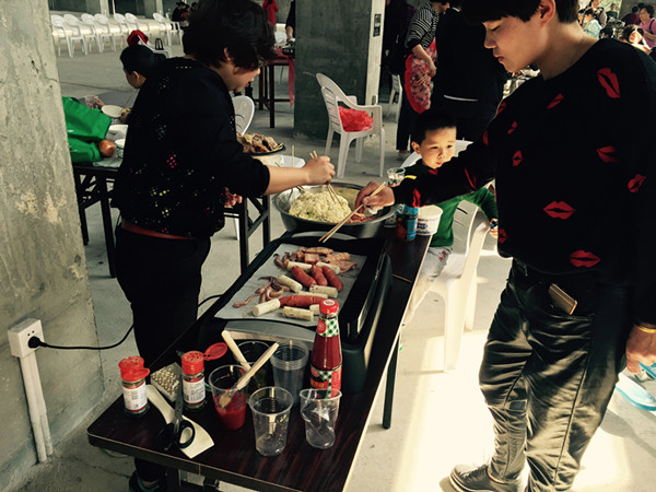 包水餃日常在家我們也經(jīng)常做,可是自己揉面搟餃子皮對(duì)于很多人來(lái)說(shuō)還是第一次。還好我們組有幾個(gè)經(jīng)驗(yàn)的姐姐,在她們的指導(dǎo)下大家分工合做,有的揉面有的搟餃子皮有的負(fù)責(zé)包。由于我們當(dāng)中還有很多是初學(xué)者,搟出來(lái)的餃子皮大小厚度各有不同,包的餃子更是融入了南北方不同手法,最后包出來(lái)的餃子形狀各異,色彩斑斕。但是自己的勞動(dòng)成果味道總是特別的好。這邊包餃子的同事們正包的起勁,那邊燒烤的同事也沒(méi)閑著不停為我們送上他們烤的烤串品嘗。燒烤的時(shí)候也是小插曲不斷,由于功率過(guò)大先是把同事家里帶來(lái)的插座燒了,后來(lái)又跳閘沒(méi)電,所幸都一一解決了,我們才能吃上色香味俱全的燒串。